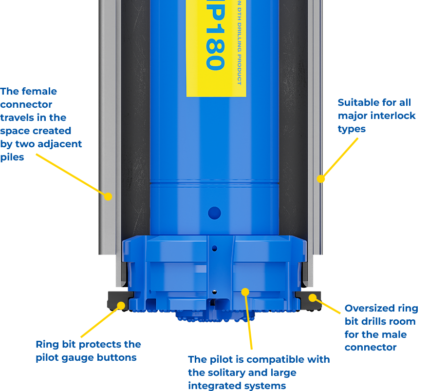 M-Wall ring bit system is a tool used to create M-Wall pipe-pile retaining walls. They can do duty as a load-bearing foundation, rather than just a wall that prevents ground masses from collapsing and they can also be made watertight and used with variety of interlocks. Solitary M-Wall system is a very cost-effective solution in situations where the risk of accidentally dropping, and possibly losing, the ring bit is not significant. In other cases, we recommend the integrated M-Wall system.
